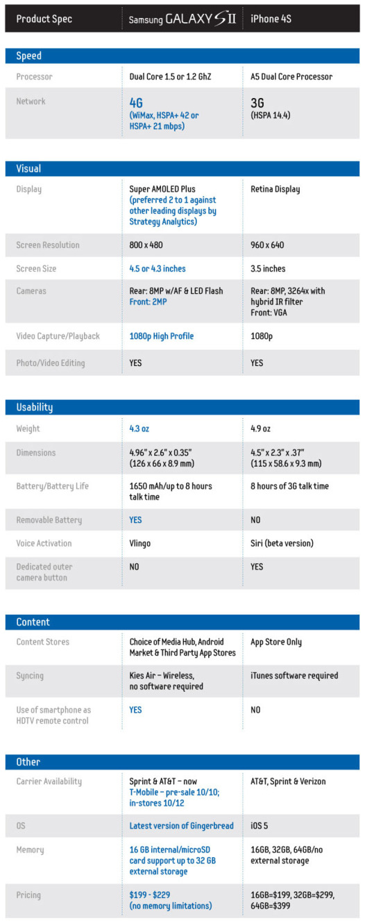 Je parlais ce matin des mobiles sous Android aux vues de ce que nous avions vu de l'iPhone 4S. Et bien c'est ni plus ni moins que Samsung qui livre ce tableau comparatif entre l'iPhone 4S et le Galaxy S II dont beaucoup de monde dit du bien.