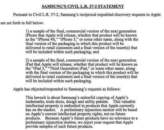 Samsung a réagi à cette "attaque" en demandant à Apple ( image ci-dessus dont l'intégralité du document est visible sur ZDNet ) de lui faire parvenir son iPhone 4S ou iPhone 5 ainsi que l'iPad 3.