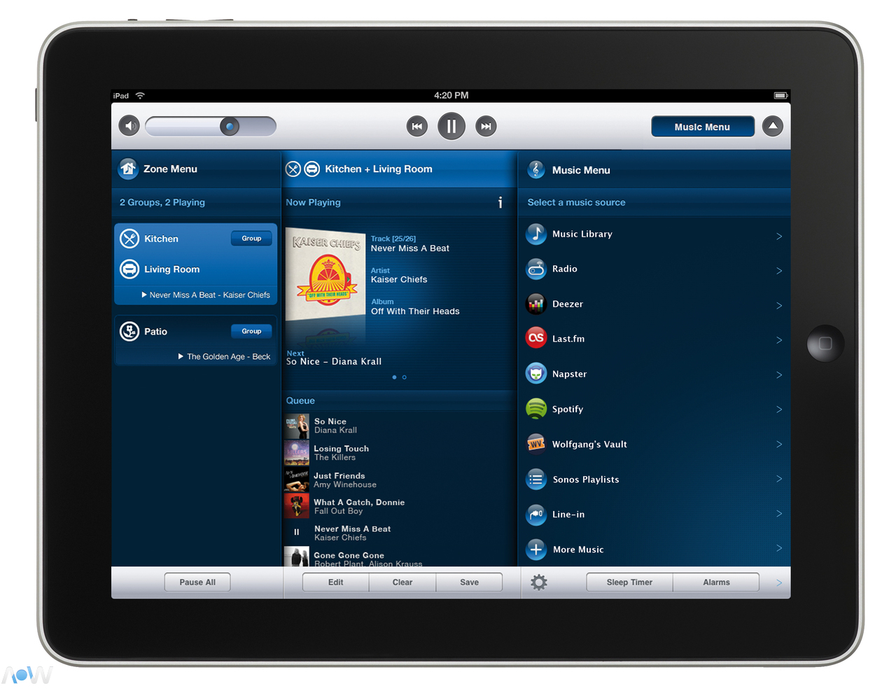 Mais ou est passé la télécommande ? Ne la cherchez plus, Sonos a son application sur iPhone, iPad et Android, j'ai vu hier l'application iPad et j'ai été assez surpris de l'efficacité en passant d'un glissement de doigt de Spotify à Deezer même si j'avoue avoir une sérieuse préférence pour la startup suédoise :)