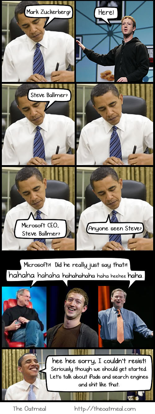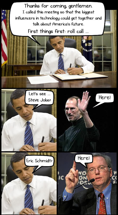 Lors du repas à la Maison Blanche organisé par le Président des Etats Unis, Barak Obama, seul Steve Ballmer manquait à l'appel aux côtés notamment de Steve Jobs, Mark Zuckerberg, Eric Schmidt, Carol Bartz ...