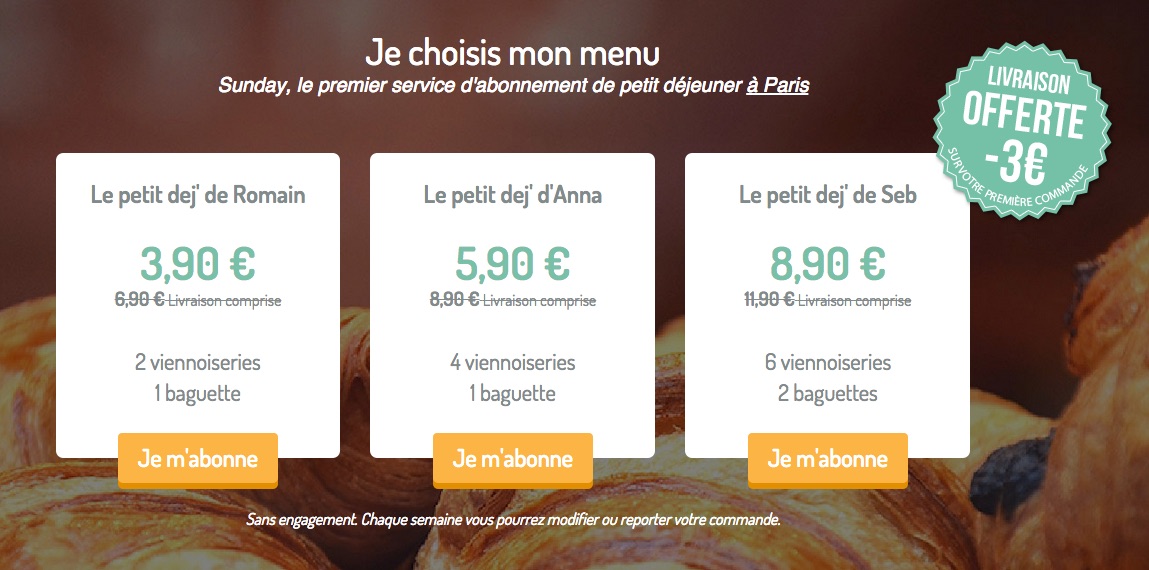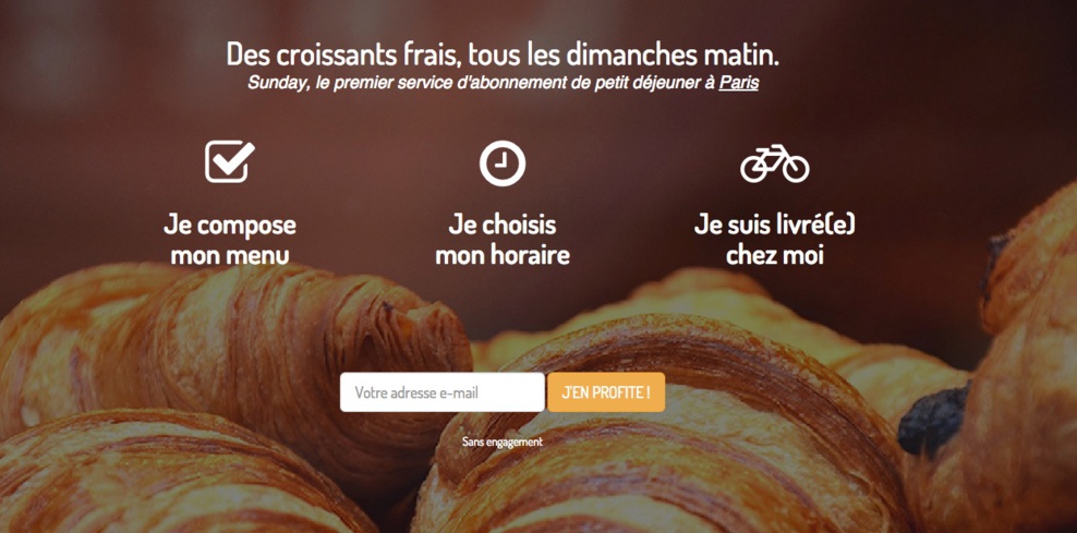 "Vos croissants sans sortir du lit le dimanche matin", c'est la promesse faite par le service Sunday. Moyennant un abonnement sans engagement avec plusieurs formules au choix vous allez pouvoir vous faire livrer le dimanche matin des viennoiseries de qualité sans bouger de chez vous.