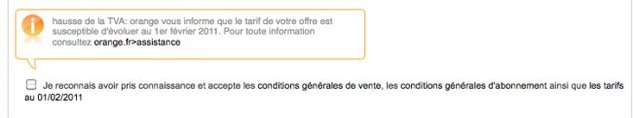 Il semblerait que Orange ait pris des mesures par rapport à ça et indique sur son site quand on veut souscrire à un forfait "avoir pris connaissance et accepte les conditions générales de vente, les conditions générales d'abonnement ainsi que les tarifs au 01/02/2011".