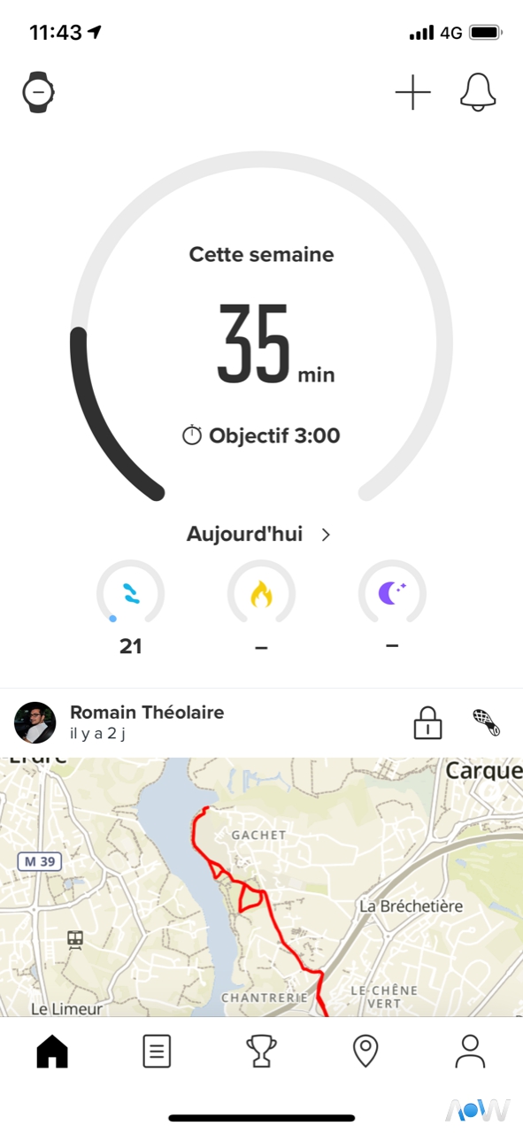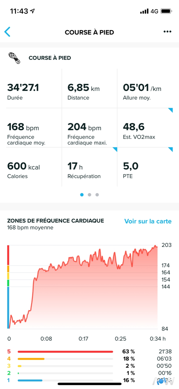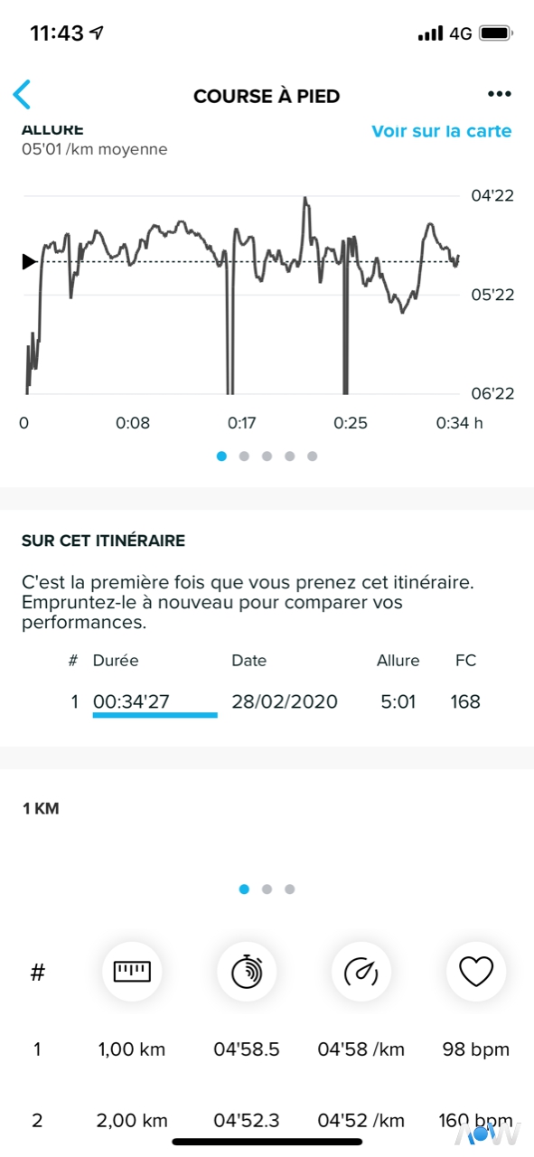 Une fois la course terminée, la montre envoie les informations en Bluetooth au téléphone. J'ai été impressionnant du nombre d'informations remontées par la montre. C'est sur cet exemple typique qu'on arrive à mieux cerner le profil de cette montre qui certes est moins polyvalente qu'une Apple Watch mais par conséquent plus précise sur pas mal de points. L'application est bien faites, en dehors du fait de pouvoir analyser ses courses, on peut personnaliser les informations affichées sur la montre et gérer les mises à jour.