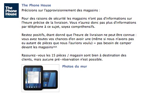 En plus, sur le compte Facebook de The Phone House, on peut lire que l'heure de livraison des Touchpad ne sera pas connu avant le démarrage de la vente, en clair, ce sera peut être à 9h du mat ou à 11h ou à 18h...