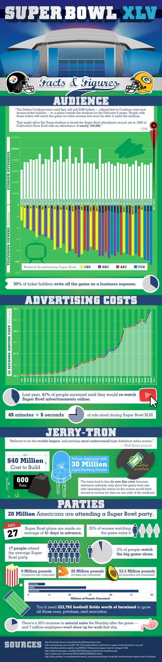 L'infographie ci-dessus offre les renseignements à propos du match de ce soir, que l'on pourra voir en direct live. Ci-dessous, l'infographie montre les enjeux financiers du Super Bowl 2011 au niveau publicitaire.