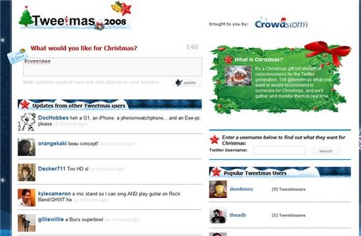 Voilà un bien joli concept, un mashup de Twitter, sur lequel vous allez pouvoir noté ce que vous voulez pour Noël et surtout, suivre les Tweetmas de vos amis pour savoir ce que eux veulent.
