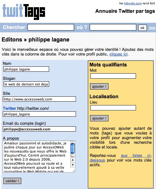 Pour commencer donc, je vais vous inviter à tous vous inscrire sur TwitTags. C'est simple et gratuit et ne prend que quelques secondes. Vous devrez préciser autant de tags que vous souhaitez ( n'hésitez pas à en mettre, c'est illimité, histoire de bien vous définir ) et également votre ou vos localisations.