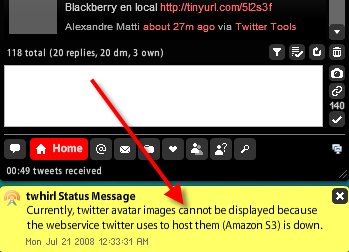 Tout le monde est au courant, hier les serveurs d'Amazon S3 ont flanché, ce qui a dû mettre un gros vent de panique, mais ce qui a provoqué, entre autre, la disparition des avatars sur Twitter, et donc sur Twhirl, etc ....