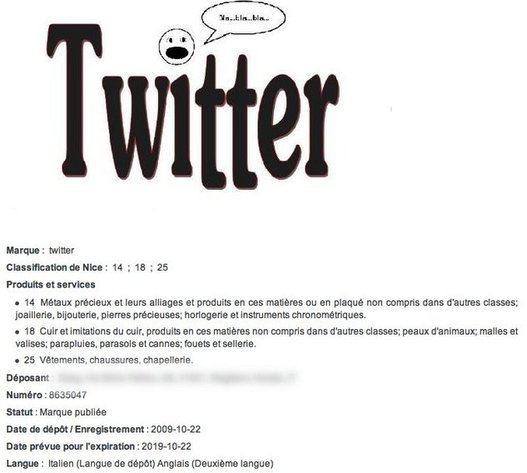Vous avez ci-dessus la preuve que Twitter est bel et bien une marque déposée italienne spécialisée dans les produits, visiblement, de luxe