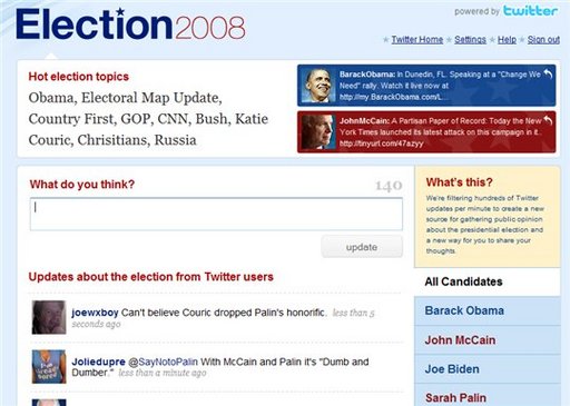 Pour tous ceux qui s'intéressent de près aux élections présidentielles américaine, Twitter a mis en place un site spécial agrégeant tous les Twit à ce propos.