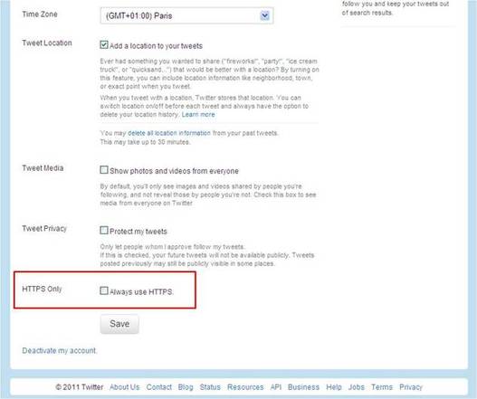 Twitter laisse tout de même le choix à l'utilisateur car il s'agit d'une case à cocher pour l'option HTTPS, l'option se trouve dans les paramètres du compte.