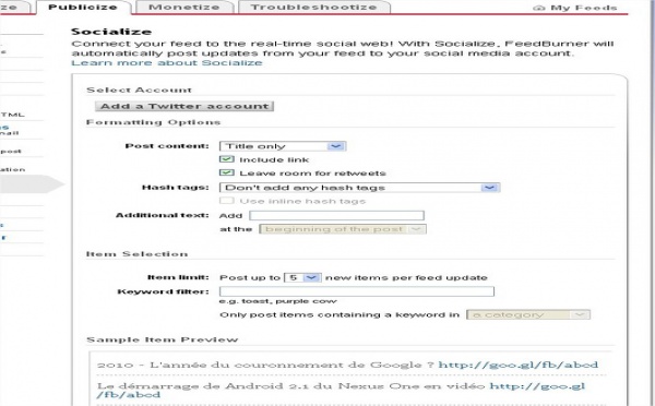 Feedburner propulse vos billets sur Twitter - 15/12/2009
