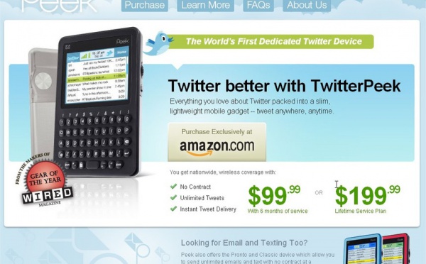 Vous avez très certainement dû entendre parler de TwitterPeek, cette machine qui ressemble à un téléphone mobile équipée d'un clavier complet, d'un écran, mais avec laquelle on ne peut pas téléphoner, on ne peut que ... Twitter :)TwitterPeek, qui n'est bien sur pas vendu chez nous, est commercialisé au prix de 99$ pour 6 mois...