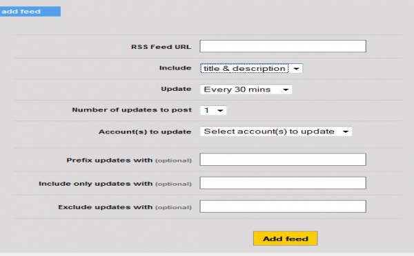 Tout le monde, ou presque connait déjà Twitterfeed, qui permet de publier son ou ses flux RSS sur un compte Twitter selon des critères choisis. RSS2Twitter propose le même genre de service : publication sur 1 ou plusieurs comptes Twitter fréquence de publication au choix un bouton " update " pour publier un fil RSS ...