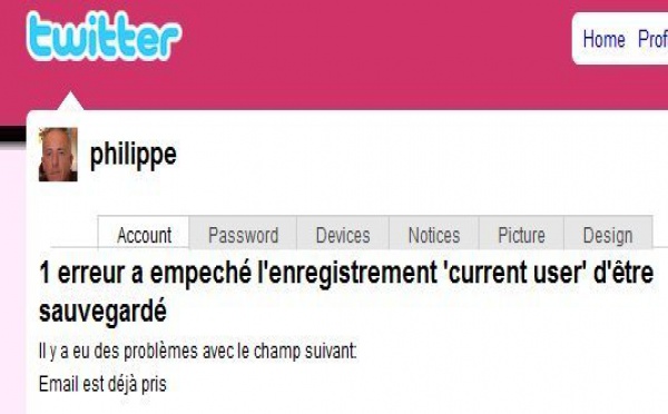 Comme vous pouvez le voir sur l'image ci-dessus, un message " d'alerte " en français s'est affiché sur mon compte Twitter alors que je tentais de modifier l'adresse mail de réception de message privé. Si j'en parle c'est qu'il ne me semblait pas que Twitter savait parler français ...... mais c'est peut être moi qui l'ai pas...
