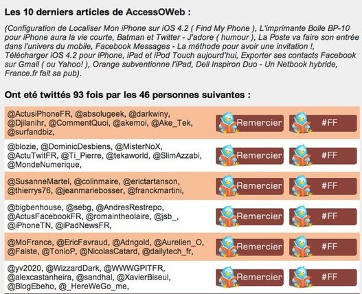 Après, 2 choix, soit vous remerciez les gens en envoyant un message sur Twitter ( en cliquant sur le bon bouton ) soit vous faites de #FF pour vos lecteurs qui Twitte vos billets.