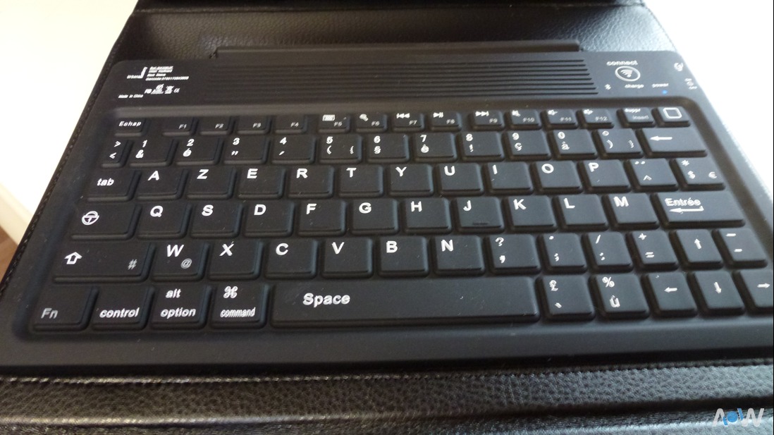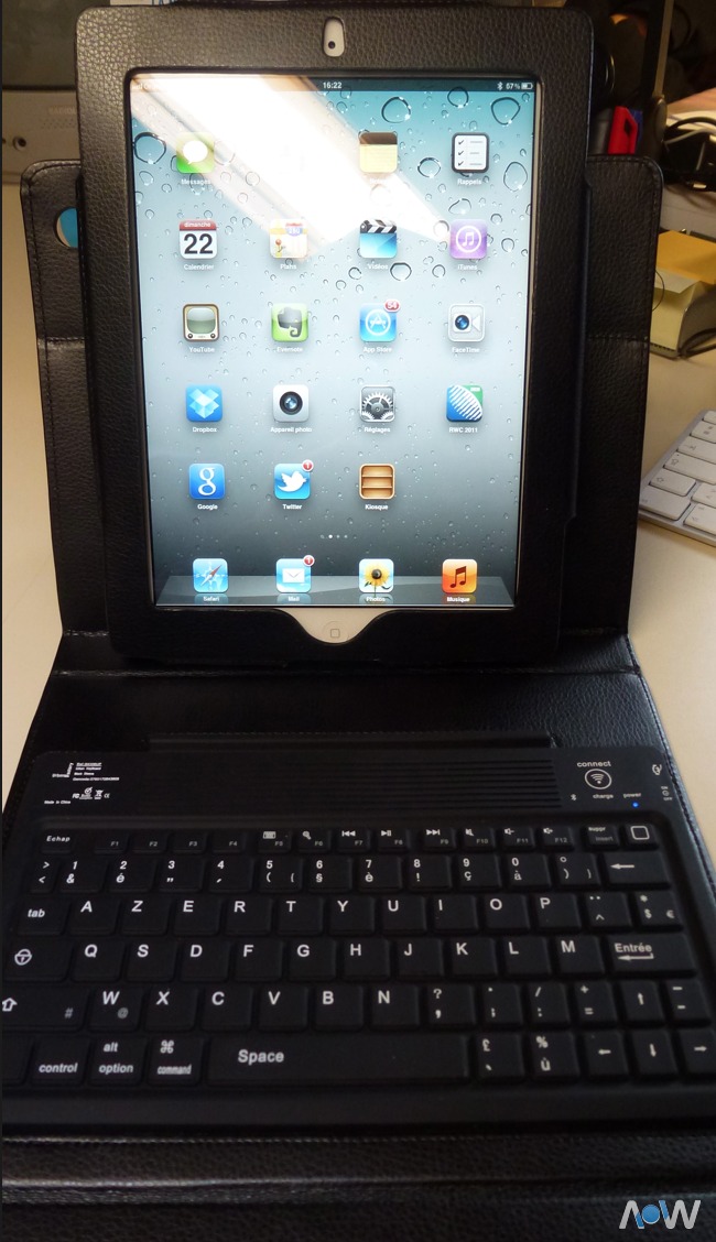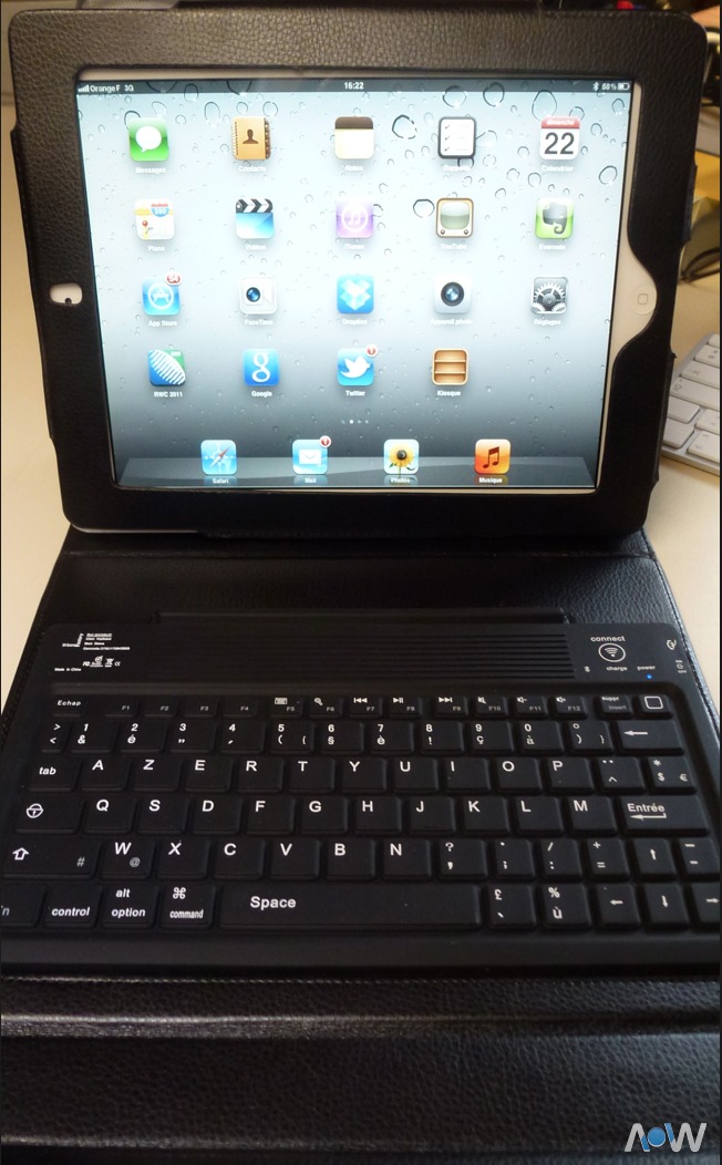 Bref, on installe l'iPad dans son logement, on démarre le clavier, on active le bluetooth sur l'iPad, on appareille les 2 et c'est parti, on tape sur le clavier en silicone et l'iPad devient écran. Très honnêtement, c'est plutôt bien foutu, le clavier n'est pas désagréable, il est grand comme un clavier de Netbook 10 pouces. A l'arrière il y a une ouverture pour l'APN de l'iPad ce qui permet, l'ensemble installé normalement pour écrire, de filmer les personnes qui sont faces à l'iPad à leur insu... mais il faut pas le dire :)