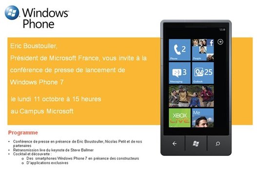 Beaucoup en ont déjà parlé, Microsoft officialise le lancement du Windows Phone 7 et celui-ci sera fait le 11 Octobre 2010 à partir de 15h et, comme vous pouvez le voir, la rédaction d'AccessOWeb est invité au Campus Microsoft pour assister à cet évènement.