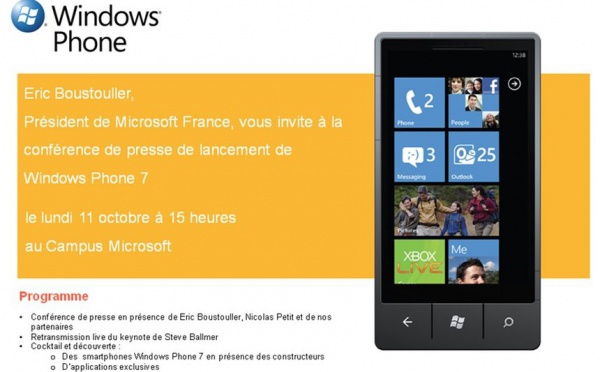 Des rumeurs circule concernant le lancement de Windows Phone 7, Microsoft a invité les journalistes à "noter la date" du 11 octobre pour une conférence de presse à 14h (heure de Londes) qui s'étendra certainement jusqu'à 17h30 pour parler de Windows Phone 7. Il semblerait que le 21 octobre soit toujours la date de lancement...