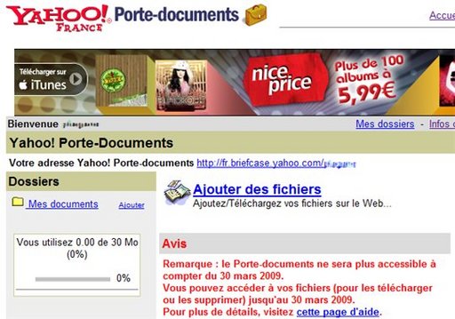 Yahoo! Briefcase fermera donc le 30 mars 2009 et Yahoo! invite tous ces membres à télécharger ou supprimer leurs documents.