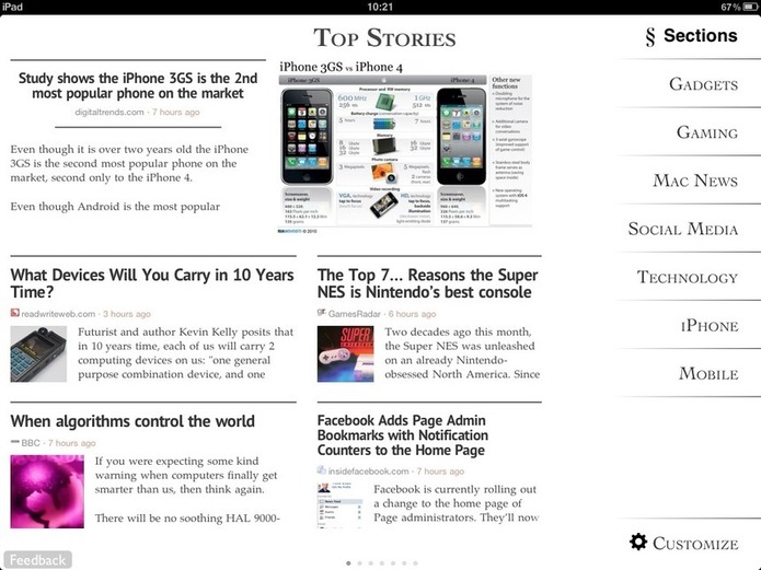 Zite, c'est une application iPad au format magasine. Son originalité est qu'elle personnalise le contenu avec vos sujets favoris. Au fil de vos lectures vous pouvez indiquer les articles qui vous plaisent très intuitivement et Zite apprend.
