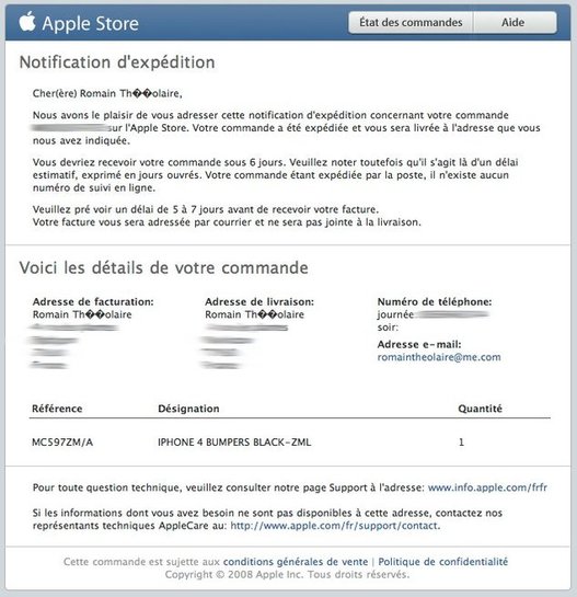 Comme beaucoup de possesseurs d'iPhone 4, j'ai téléchargé l'application iPhone "Opération Etui" la semaine dernière pour commander un étui gratuitement. Le délai moyen d’expédition était de 3 à 5 semaines, ce qui était prévisible compte tenu du succès de l'opération. A ma grande surprise je viens de recevoir un mail ce matin me notifiant de l'envoi du bumper à mon domicile.