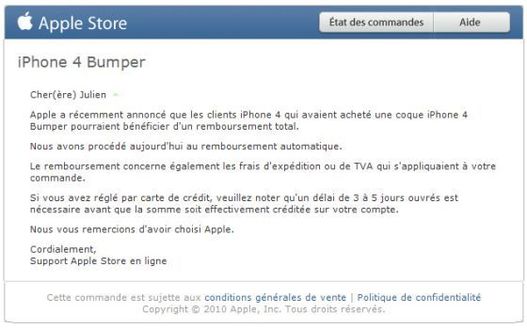 Les acheteurs de cette fameuse housse commencent à recevoir un email de notification d'un remboursement automatique se faisant par re-créditation sur la carte de crédit dans un délai de 3 à 7 jours, cela est applicable pour l'instant uniquement à ceux qui ont achetés leur bumper en ligne. Apple devrait dans les jours qui viennent donner plus de renseignements pour ceux qui l'ont acheté dans un Apple Store et surtout communiquer les modalités d'achat pour ceux qui n'ont pas encore été tenté de l'acheter.