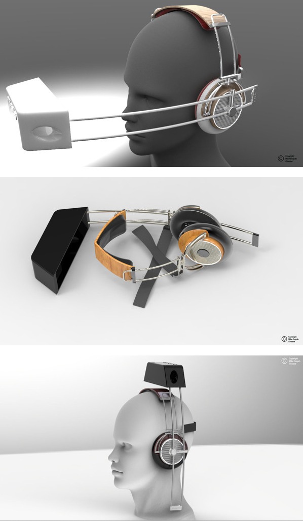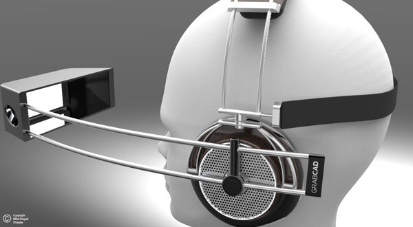 L'iPhone 5 est placé dans un espèce de boitier, à bonne distance des yeux, le boitier est suffisamment profond pour éviter les reflets et c'est un casque bluetooth qui tient l'ensemble, le boitier pouvant pivoter au dessus du casque comme on le faisait à l'époque des premiers micros casques.