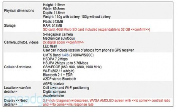 Le Google Phone, Nexus One, présenterait, si cela se confirme, les caractéristiques ci-dessus, dont on peut souligner les points suivants : écran AMOLED de 3,7 pouces du Wifi 802.11n une épaisseur de 11,5mm soit un peu plus fin que l'iPhone 3G ou 3GS un APN de 5 Mpixels avec autofocus et flash le bluetooth 2.1 + EDR ...
