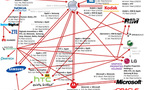 L'image ci dessus nous montre les relations conflictuelles qu'il peut y avoir entre différents grands acteurs du mobile dans le monde. Evidemment, Apple est source de convoitise, et ce dernier n'hésites plus à envoyer ces avocats au charbon quand il s'agit de défendre les technologies développés...