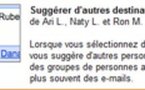 Une nouveauté dans le Labs de Gmail, la suggestion de destinataires. En fait, si vous utilisez cette nouvelle fonctionnalité, lors de l'envoi d'un email à une personne, si celle-ci fait parti d'un groupe de mails créé sur Gmail, alors Gmail vous suggèrera d'envoyer ce même email à d'autres...