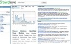 CrowdEye, conçu par Ken Moss, ancien directeur de la division Recherche chez Microsoft, est un moteur de recherche sur Twitter. Comme on le voit sur l'image, CrowdEye offre différents types de résultats selon la recherche effectuée : des HashTags les Twit populaires les derniers messages...